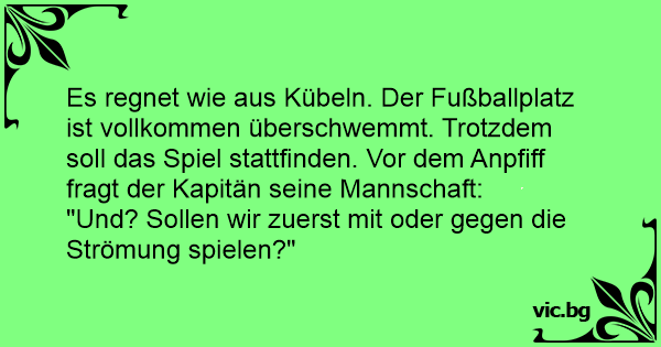 Es regnet wie aus Kübeln. Der Fußballplatz ist vollkommen überschwemmt. Trotzdem soll das Spiel stattfinden. Vor dem Anpfiff fragt der Kapitän seine Mannschaft: