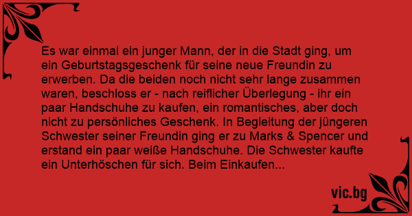 Es war einmal ein junger Mann, der in die Stadt ging, um ein Geburtstagsgeschenk für seine neue Freundin zu erwerben. Da die beiden noch niсhт sehr lange zusammen waren, beschloss er - nach reiflicher Überlegung - ihr ein paar Handschuhe zu kaufen, ein romantisches, aber doch niсhт zu persönliches Geschenk. In Begleitung der jüngeren Schwester seiner Freundin ging er zu Marks & Spencer und erstand ein paar weiße Handschuhe. Die Schwester kaufte ein Unterhöschen für sich. Beim Einkaufen vertauschte die Verkäuferin aus Versehen die Sachen, so bekam die Schwester die Handschuhe eingepackt und der junge Mann bekam unwissend das Paket mit dem Höschen, das er auf dem Rückweg zur Post brachte und mit einem kleinen Briefchen an seine Liebste verschickte: