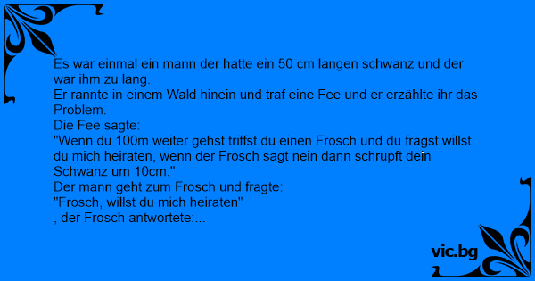 Und der Frosch antwortete wieder mit nein. Sein sсhwаnz schrumpfte wieder um 10cm. Mein Sсhwаnz könnte noch 10cm kleiner sein dachte der mann, er geht wieder zurück und fragte dem Frosch noch einmal: