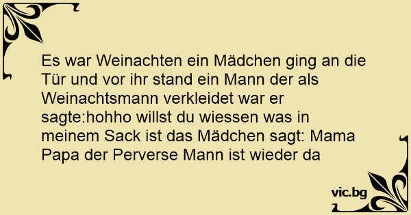 Es war Weinachten ein Mädchen ging an die Tür und vor ihr stand ein Mann der als Weinachtsmann verkleidet war er sagte:hohho willst du wiessen was in meinem Sack ist das Mädchen sagt: Mama Papa der Perverse Mann ist wieder da