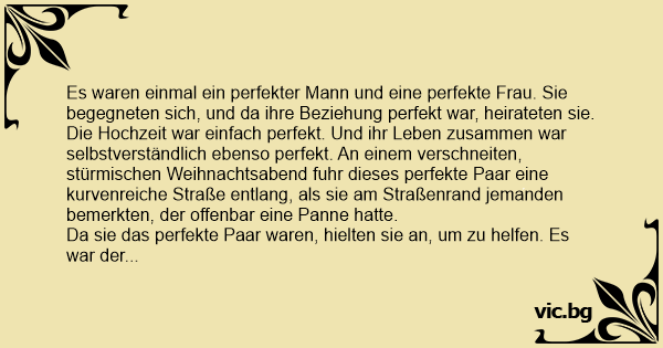 Es waren einmal ein perfekter Mann und eine perfekte Frau. Sie begegneten sich, und da ihre Beziehung perfekt war, heirateten sie. Die Hochzeit war einfach perfekt. Und ihr Leben zusammen war selbstverständlich ebenso perfekt. An einem verschneiten, stürmischen Weihnachtsabend fuhr dieses perfekte Paar eine kurvenreiche Straße entlang, als sie am Straßenrand jemanden bemerkten, der offenbar eine Panne hatte.