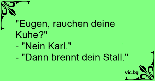 Ryger dine køer? To bondemænd står og snakker. Den ene: Ryger dine køer? Den anden: Nej. Den ene: Så er der ild i din lade.