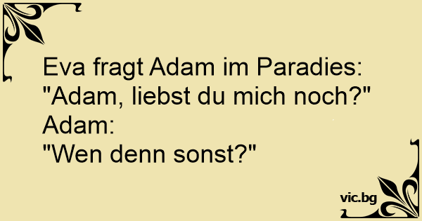 Adam en Eva lopen door hun paradijs wanneer Eva ineens vraagt “Adam, hou jij nog steeds van mij?” waarop Adam antwoordt “Ja natuurlijk, van wie anders?”