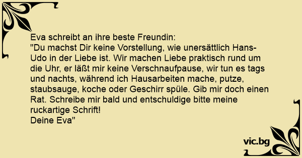 "Du machst Dir keine Vorstellung, wie unersättlich Hans-Udo in der Liebe ist. Wir machen Liebe praktisch rund um die Uhr, er läßt mir keine Verschnaufpause, wir tun es tags und nachts, während ich Hausarbeiten mache, putze, staubsauge, koche oder Geschirr spüle. Gib mir doch einen Rat. Schreibe mir bald und entschuldige bitte meine ruckartige Schrift!