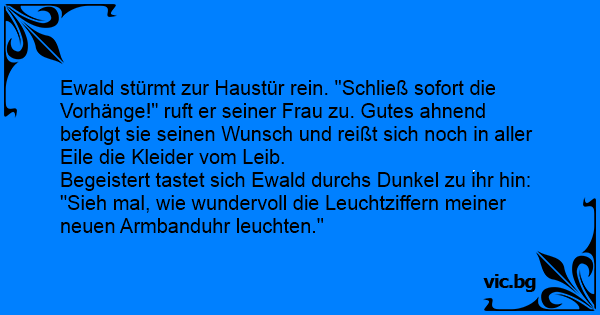 Ewald stürmt zur Haustür rein. "Schließ sofort die Vorhänge!" ruft er seiner Frau zu. Gutes ahnend befolgt sie seinen Wunsch und reißt sich noch in aller Eile die Kleider vom Leib.