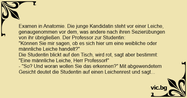 В час по анатомия, професор показва човешки скелет и пита: - Кой може да ми каже, дали скелета е на жена или мъж? Една студентка вдига ръка и казва: - На мъж е! Професорът я помолил да се...