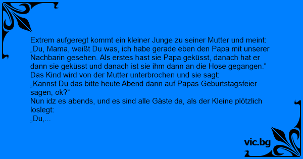 „Du, Mama, weißt Du was, ich habe gerade eben den Papa mit unserer Nachbarin gesehen. Als erstes hast sie Papa geküsst, danach hat er dann sie geküsst und danach ist sie ihm dann an die Hose gegangen.“