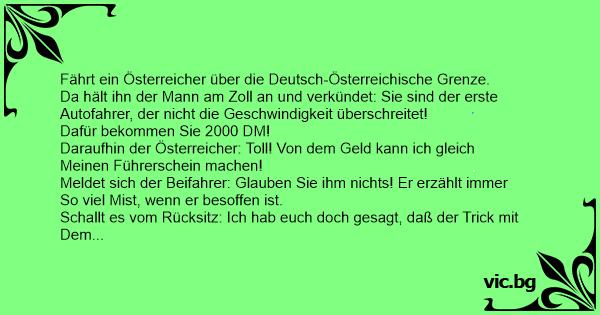 Ein Auto fährt über die Grenze und wird von einem Polizisten angehalten. „Herzlichen Glückunsch! Sie sind der hunderttausendste Autofahrer, der diese Grenze passiert. Dafür bekommen Sie 8.200 Euro....