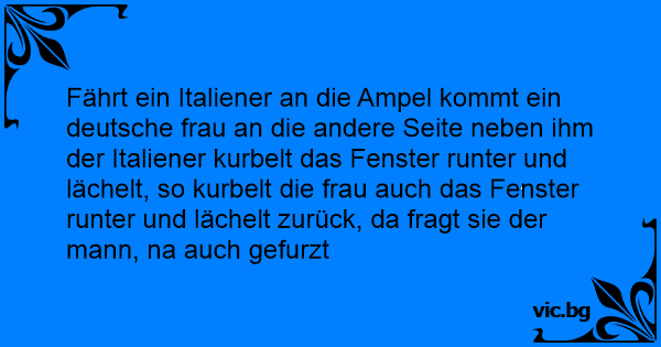 Fährt ein Italiener an die Ampel kommt ein deutsche frau an die andere Seite neben ihm der Italiener kurbelt das Fenster runter und lächelt, so kurbelt die frau auch das Fenster runter und lächelt zurück, da fragt sie der mann, na auch gefurzt