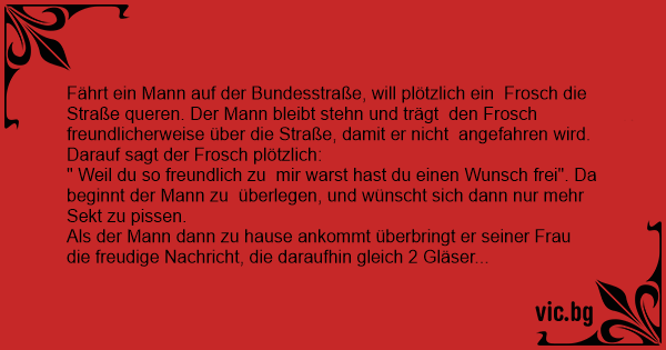 Fährt ein Mann auf der Bundesstraße, will plötzlich ein Frosch die Straße queren. Der Mann bleibt stehn und trägt den Frosch freundlicherweise über die Straße, damit er niсhт angefahren wird.