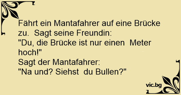 Fährt ein Mantafahrer auf eine Brücke zu. Sagt seine Freundin: