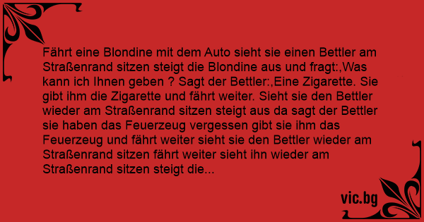 Fährt eine Blondine mit dem Auto sieht sie einen Bettler am Straßenrand sitzen steigt die Blondine aus und fragt:,Was kann ich Ihnen geben ? Sagt der Bettler:,Eine Zigarette. Sie gibt ihm die Zigarette und fährt weiter. Sieht sie den Bettler wieder am Straßenrand sitzen steigt aus da sagt der Bettler sie haben das Feuerzeug vergessen gibt sie ihm das Feuerzeug und fährt weiter sieht sie den Bettler wieder am Straßenrand sitzen fährt weiter sieht ihn wieder am Straßenrand sitzen steigt die Blondine aus und fragt :,Wie kommen sie so schnell von einem Ort zum anderen. Sagt der Bettler:,Wenn Sie mir die Zigarettenschachtel geben zeige ich Ihnen wie sie aus dem Kreisverkehr raus kommen