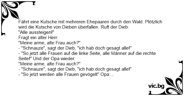 Fährt eine Kutsche mit mehreren Ehepaaren durch den Wald. Plötzlich wird die Kutsche von Dieben überfallen. Ruft der Dieb: