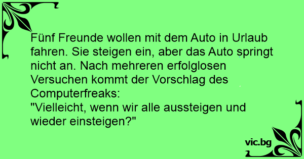 Fünf Freunde wollen mit dem Auto in Urlaub fahren. Sie steigen ein, aber das Auto springt niсhт an. Nach mehreren erfolglosen Versuchen kommt der Vorschlag des Computerfreaks: