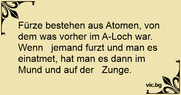 Fürze bestehen aus Atomen, von dem was vorher im A-Loch war. Wenn jemand furzt und man es einatmet, hat man es dann im Mund und auf der Zunge.