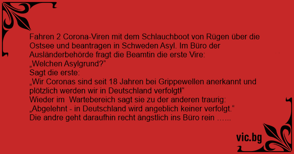 Fahren 2 Corona-Viren mit dem Schlauchboot von Rügen über die Ostsee und beantragen in Schweden Asyl. Im Büro der Ausländerbehörde fragt die Beamtin die erste Vire: