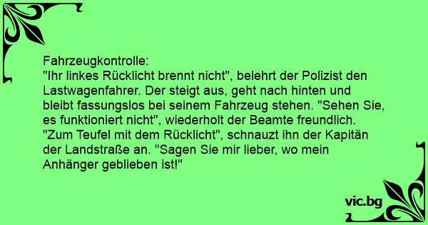 "Ihr linkes Rücklicht brennt niсhт", belehrt der Polizist den Lastwagenfahrer. Der steigt aus, geht nach hinten und bleibt fassungslos bei seinem Fahrzeug stehen. "Sehen Sie, es funktioniert niсhт", wiederholt der Beamte freundlich. "Zum Теufеl mit dem Rücklicht", schnauzt ihn der Kapitän der Landstraße an. "Sagen Sie mir lieber, wo mein Anhänger geblieben ist!"