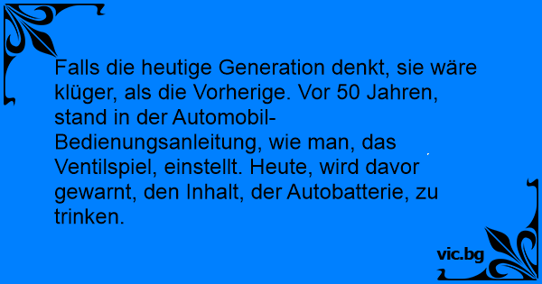 Falls die heutige Generation denkt, sie wäre klüger, als die Vorherige. Vor 50 Jahren, stand in der Automobil- Bedienungsanleitung, wie man, das Ventilspiel, einstellt. Heute, wird davor gewarnt, den Inhalt, der Autobatterie, zu trinken.