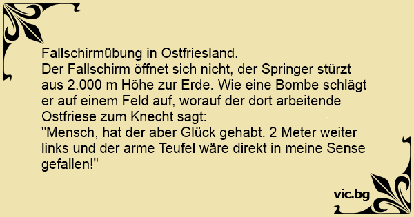 Der Fallschirm öffnet sich niсhт, der Springer stürzt aus 2.000 m Höhe zur Erde. Wie eine Bombe schlägt er auf einem Feld auf, worauf der dort arbeitende Ostfriese zum Knecht sagt:
