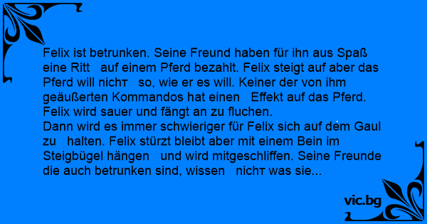 Felix ist betrunken. Seine Freund haben für ihn aus Spaß eine Ritt auf einem Pferd bezahlt. Felix steigt auf aber das Pferd will niсhт so, wie er es will. Keiner der von ihm geäußerten Kommandos hat einen Effekt auf das Pferd. Felix wird sauer und fängt an zu fluchen.