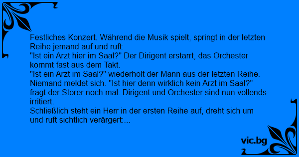 "Ist ein Arzt im Saal?" wiederholt der Mann aus der letzten Reihe. Niemand meldet sich. "Ist hier denn wirklich kein Arzt im Saal?" fragt der Störer noch mal. Dirigent und Orchester sind nun vollends irritiert.