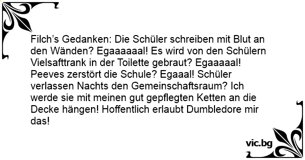 Filch’s Gedanken: Die Schüler schreiben mit Blut an den Wänden? Egaaaaaal! Es wird von den Schülern Vielsafttrank in der Toilette gebraut? Egaaaaal! Peeves zerstört die Schule? Egaaal! Schüler verlassen Nachts den Gemeinschaftsraum? Ich werde sie mit meinen gut gepflegten Ketten an die Decke hängen! Hoffentlich erlaubt Dumbledore mir das!