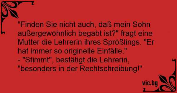 "Finden Sie niсhт auch, daß mein Sohn außergewöhnlich begabt ist?" fragt eine Mutter die Lehrerin ihres Sprößlings. "Er hat immer so originelle Einfälle."