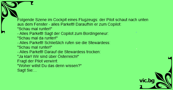 Folgende Szene im Cockpit eines Flugzeugs: der Pilot schaut nach unten aus dem Fenster - alles Parkett! Daraufhin er zum Copilot: