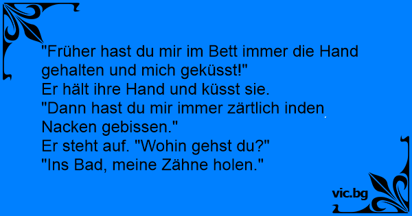 След 35 години брак, в леглото. Тя: - Когато ме сваляше, ме държеше за ръка и ме гушкаше... Той уморено се пресяга, прегръща я и пак се унася. Тя: - После ме целуваше... Той, леко раздразнен, я...