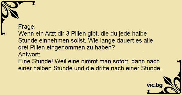 Wenn ein Arzt dir 3 Pillen gibt, die du jede halbe Stunde einnehmen sollst. Wie lange dauert es alle drei Pillen eingenommen zu haben?