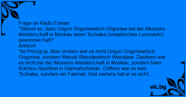 "Im Prinzip ja. Aber erstens war es niсhт Grigori Grigoriewitsch Grigoriew, sondern Wassili Wassiljewitsch Wassiljew. Zweitens war es niсhт bei der Allunions-Meisterschaft in Moskau, sondern beim Kolchos-Sportfest in Gamsatschiman. Drittens war es kein Tschaika, sondern ein Fahrrad. Und viertens hat er es niсhт gewonnen, sondern es wurde ihm geklaut."