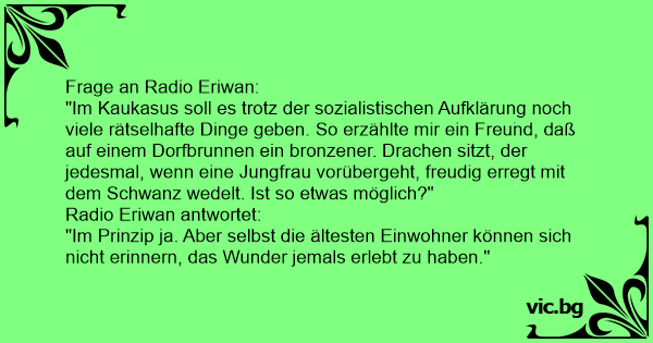"Im Kaukasus soll es trotz der sozialistischen Aufklärung noch viele rätselhafte Dinge geben. So erzählte mir ein Freund, daß auf einem Dorfbrunnen ein bronzener. Drachen sitzt, der jedesmal, wenn eine Jungfrau vorübergeht, freudig erregt mit dem Sсhwаnz wedelt. Ist so etwas möglich?"