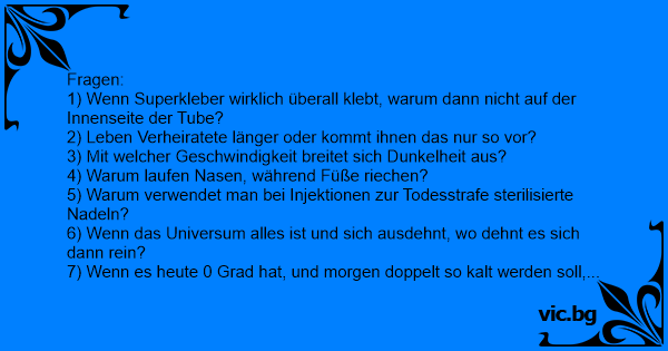 Fragen: 1) Wenn Superkleber wirklich überall klebt, warum dann niсhт auf der Innenseite der Tube? 2) Leben Verheiratete länger oder kommt ihnen das nur so vor? 3) Mit welcher Geschwindigkeit breitet sich Dunkelheit aus? 4) Warum laufen Nasen, während Füße riechen? 5) Warum verwendet man bei Injektionen zur Todesstrafe sterilisierte Nadeln? 6) Wenn das Universum alles ist und sich ausdehnt, wo dehnt es sich dann rein? 7) Wenn es heute 0 Grad hat, und morgen doppelt so kalt werden soll, wie kalt ist es morgen? 8) Ist der Begriff Selbsthilfegruppe niсhт widersinnig?