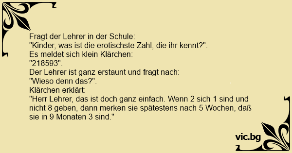 "Herr Lehrer, das ist doch ganz einfach. Wenn 2 sich 1 sind und niсhт 8 geben, dann merken sie spätestens nach 5 Wochen, daß sie in 9 Monaten 3 sind."