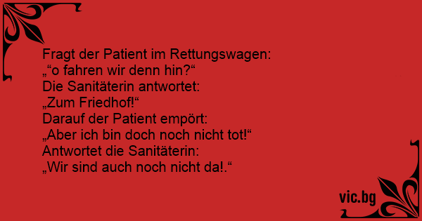 «Hvor tar du meg egentlig» spurte pasienten. «Til likhuset» svarte legen. «Hva?» Pasienten fikk panikk. «Men jeg er ikke død ennå!» «Så er vi heller ikke der ennå» sa legen.