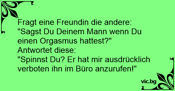 "Sagst du es deinem Mann jedes Mal, wenn du einen Orgasmus hast?" "Ach nein, weißt du, er mag es nicht, wenn ich ihn zu oft im Büro anrufe."