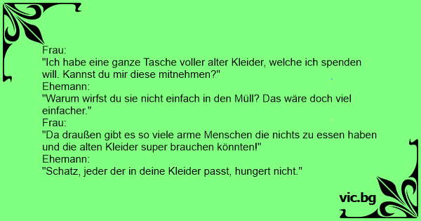 Sie: "Ich habe hier eine Tüte mit Kleidung, die ich nicht mehr trage. Ich will sie spenden." Er: "Warum wirfst du sie nicht einfach in den Müll, ist doch viel einfacher?" Sie: "Aber es gibt arme,...