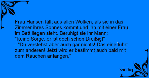 Frau Hansen fällt aus allen Wolken, als sie in das Zimmer ihres Sohnes kommt und ihn mit einer Frau im Bett liegen sieht. Beruhigt sie ihr Mann: