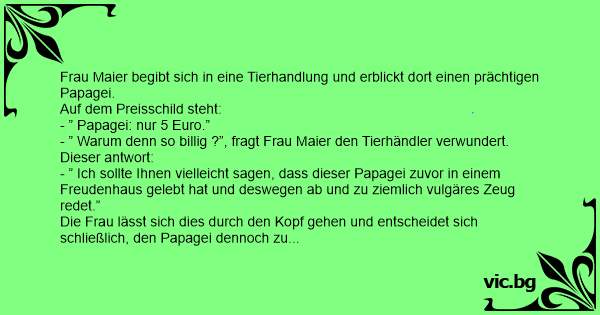 Kommt eine Frau in die Tierhandlung und fragt nach einem Papagei. Der Verkäufer meint: