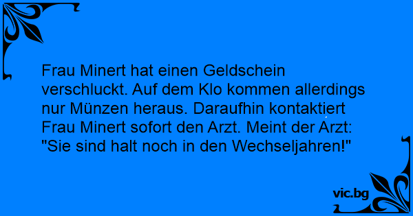 Frau Minert hat einen Geldschein verschluckt. Auf dem Klo kommen allerdings nur Münzen heraus. Daraufhin kontaktiert Frau Minert sofort den Arzt. Meint der Arzt: