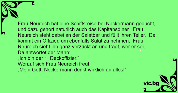 Frau Neureich hat eine Schiffsreise bei Neckermann gebucht, und dazu gehört natürlich auch das Kapitänsdiner. Frau Neureich steht dabei an der Salatbar und füllt ihren Teller. Da kommt ein Offizier, um ebenfalls Salat zu nehmen. Frau Neureich sieht ihn ganz verzückt an und fragt, wer er sei.
