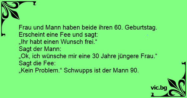 Ein 60jähriges Ehepaar sitzt beim Frühstück, plötzlich kommt eine Fee vorbei. Sagt die Fee: "Ihr habt beide einen Wunsch frei!" Sagt der Mann: Äh, ja also, ich hätte gerne eine Frau die dreißig Jahre jünger ist als ich!" Sagt die Fee: "Öhhh, mal sehen, das geht sicher", und schwingt ihren...