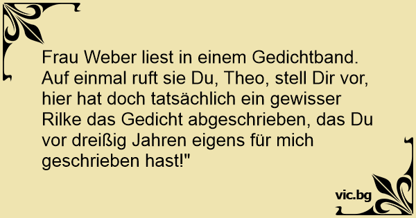 Frau Weber liest in einem Gedichtband. Auf einmal ruft sie Du, Theo, stell Dir vor, hier hat doch tatsächlich ein gewisser Rilke das Gedicht abgeschrieben, das Du vor dreißig Jahren eigens für mich geschrieben hast!"