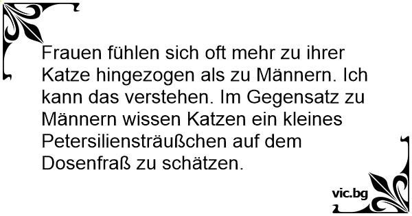 Frauen fühlen sich oft mehr zu ihrer Katze hingezogen als zu Männern. Ich kann das verstehen. Im Gegensatz zu Männern wissen Katzen ein kleines Petersiliensträußchen auf dem Dosenfraß zu schätzen.
