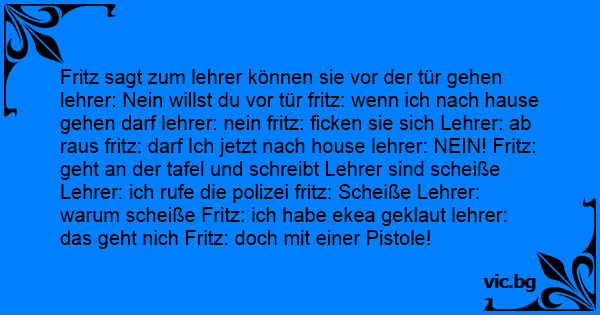 Fritz sagt zum lehrer können sie vor der tür gehen lehrer: Nein willst du vor tür fritz: wenn ich nach hause gehen darf lehrer: nein fritz: fiскеn sie sich Lehrer: ab raus fritz: darf Ich jetzt nach house lehrer: NEIN! Fritz: geht an der tafel und schreibt Lehrer sind sсhеißе Lehrer: ich rufe die polizei fritz: Sсhеißе Lehrer: warum sсhеißе Fritz: ich habe ekea geklaut lehrer: das geht nich Fritz: doch mit einer Pistole!