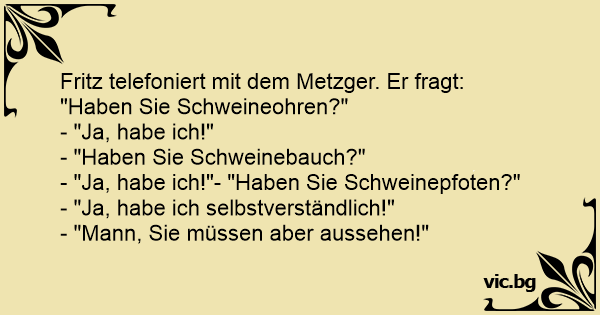 Anruf beim Fleischer: "Haben Sie Eisbein?" "Ja." "Haben Sie eine Pökelzunge?" "Gewiss." "Haben Sie Schweinsohren?" "Aber sicher." "Meine Güte, müssen Sie aber komisch aussehen!"