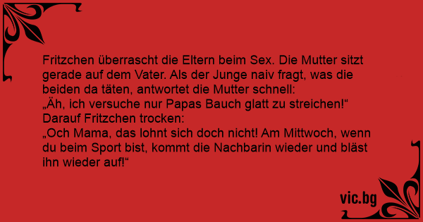 En dag när den lille gossen öppnade sovrumsdörren låg mamma och drog fram och tillbaks på pappas snopp. Gossen frågade vad de gjorde, varpå mamman generat harklade sig och sa: - Det är så att...