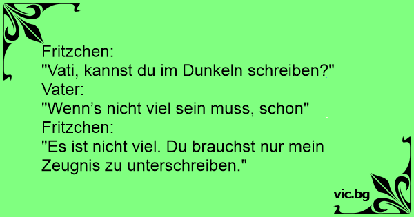 Noch mehr einfache Witze: Elfriede: "Papa, kannst du mit geschlossenen Augen schreiben?" Papa: "Ja, ich denke, dass ich das kann". Elfriede: "Ok, dann unterschreib mal bitte mein Zeugnis."