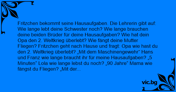 Fritzchen bekommt seine Hausaufgaben. Die Lehrerin gibt auf: Wie lange lebt deine Schwester noch? Wie lange brauchen deine beiden Brüder für deine Hausaufgaben? Wie hat dein Opa den 2. Weltkrieg überlebt? Wie fängt deine Mutter Fliegen? Fritzchen geht nach Hause und fragt: Opa wie hast du den 2. Weltkrieg überlebt? „Mit dem Maschinengewehr“ Hans und Franz wie lange braucht ihr für meine Hausaufgaben? „5 Minuten“ Lola wie lange lebst du noch? „90 Jahre“ Mama wie fängst du Fliegen? „Mit der Fliegenklatsche“ Fritzchen schreibt aus Versehen alles falsch herum auf. In der Schule: Mein Opa hat den 2. Weltkrieg mit der Fliegenklatsche überlebt. Meine Brüder brauchen 90 Jahre für die Hausaufgaben. Meine Schwester lebt noch 5 Minuten. Meine Mutter fängt mit dem Maschinengewehr Fliegen.