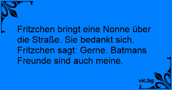Fritzchen bringt eine Nonne über die Straße. Sie bedankt sich. Fritzchen sagt: Gerne. Batmans Freunde sind auch meine.